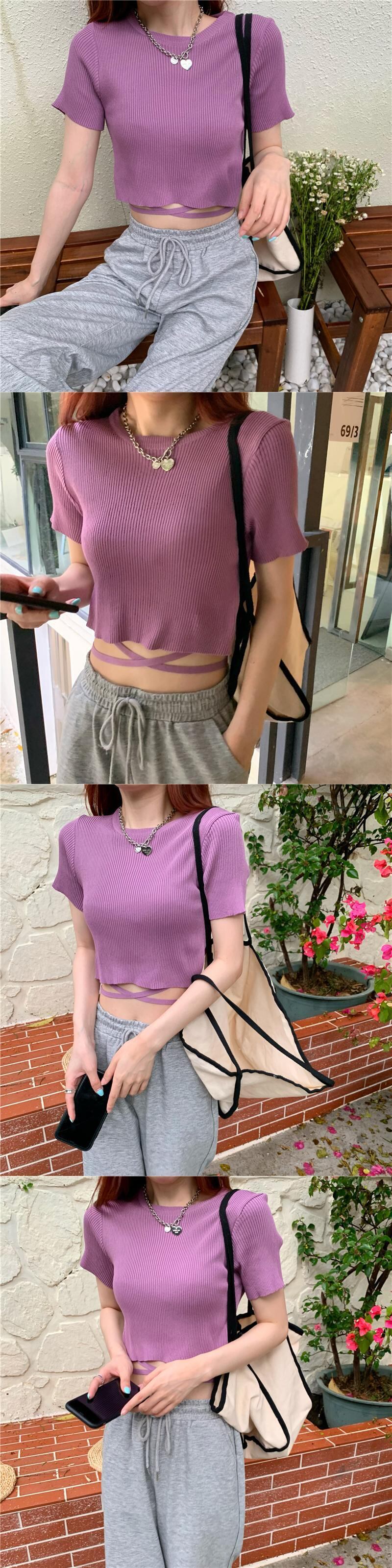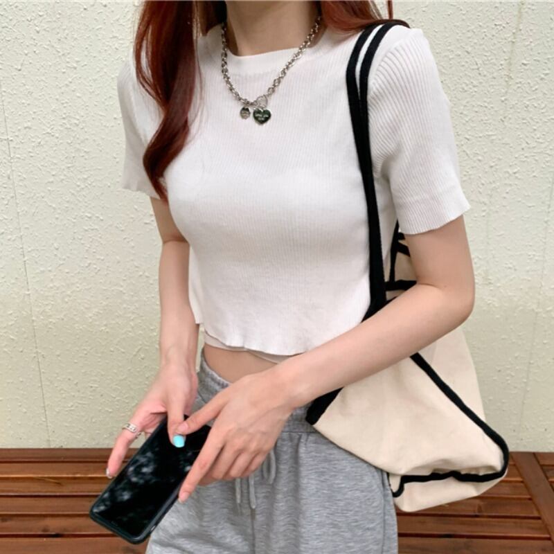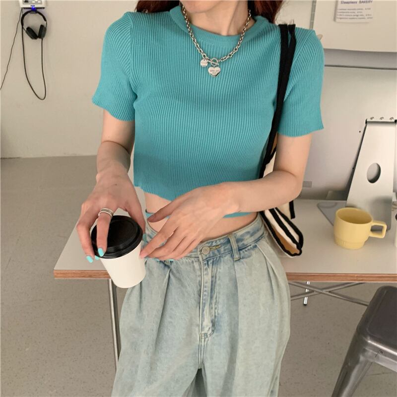 サマースタイルラウンドネック半袖スリーブスリムニットトップス レディース ショート ハーフスリーブ 夏物 Oネック ハンチェンe35278418835