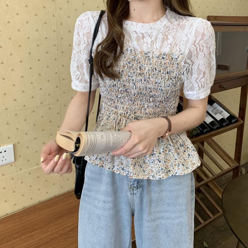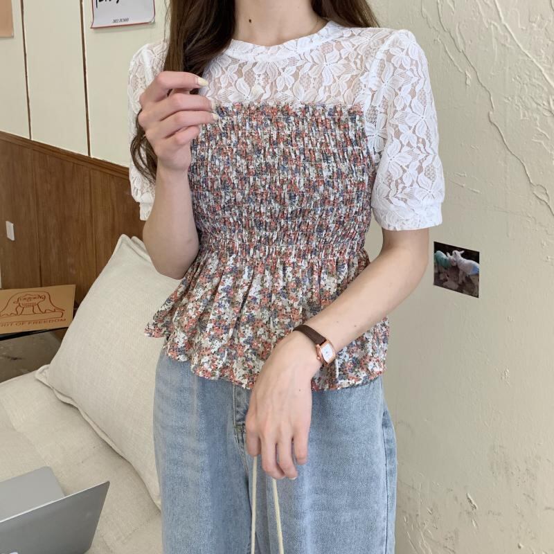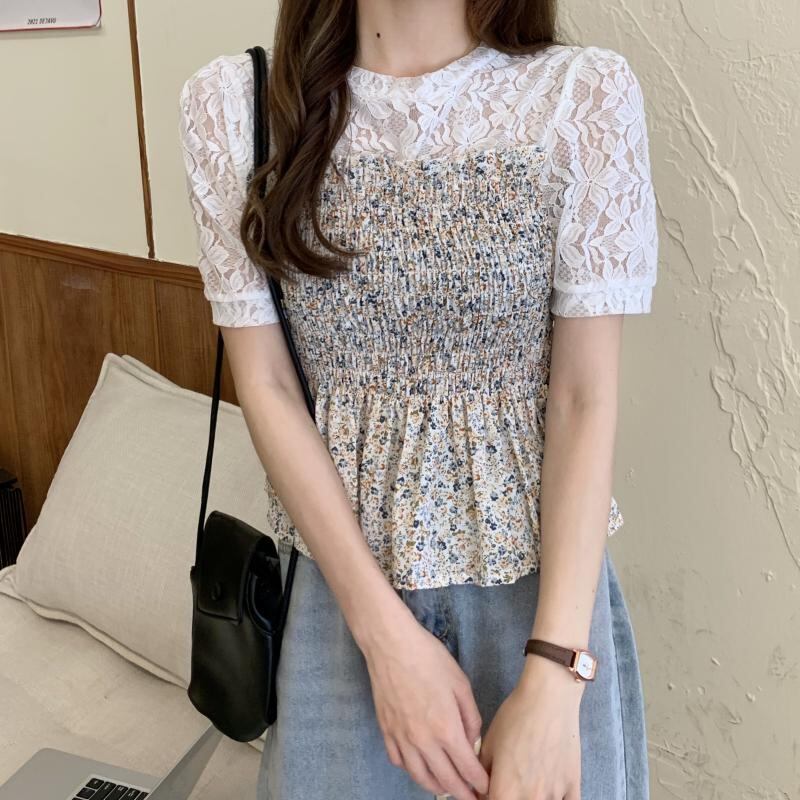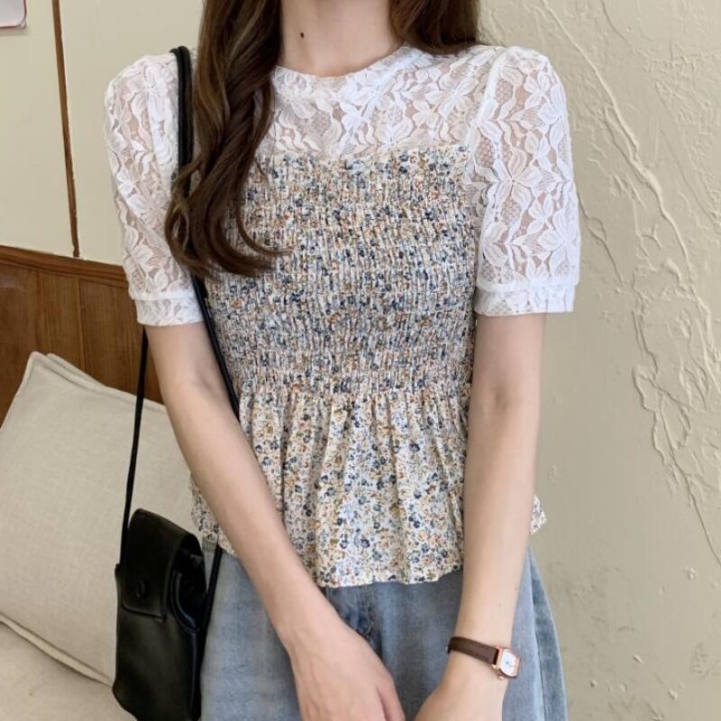 フローラルシャツ レディースサマースタイルラウンドネックレーストップス 夏物 花柄 Oネック ステッチ ハンチェンe79752403752