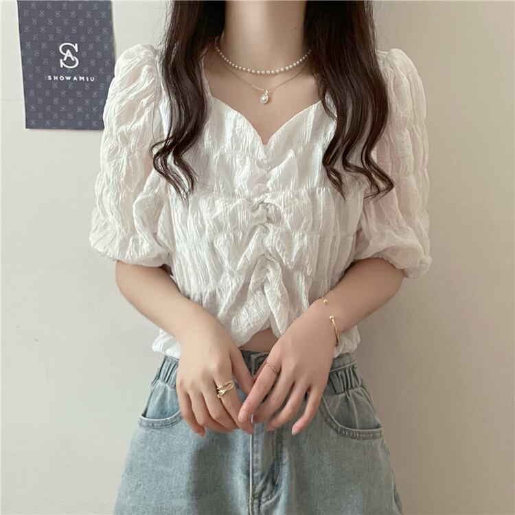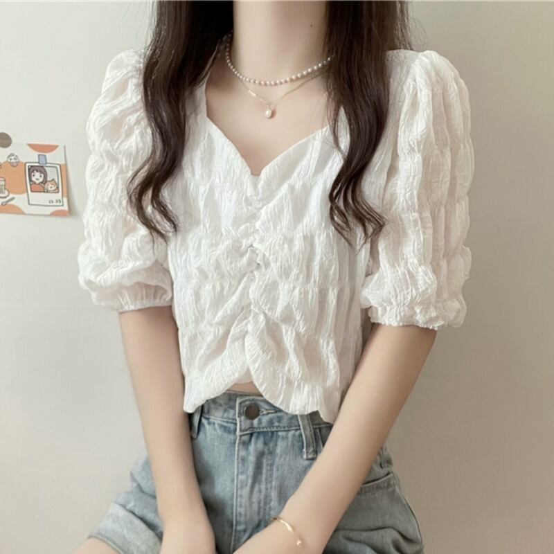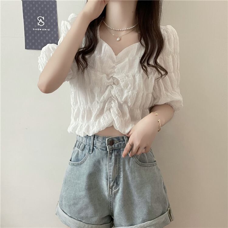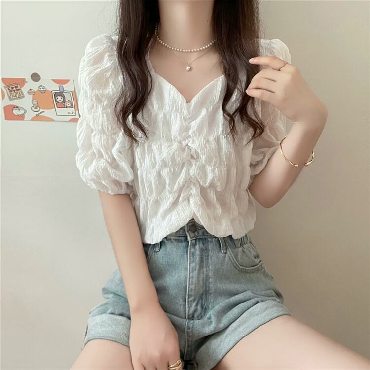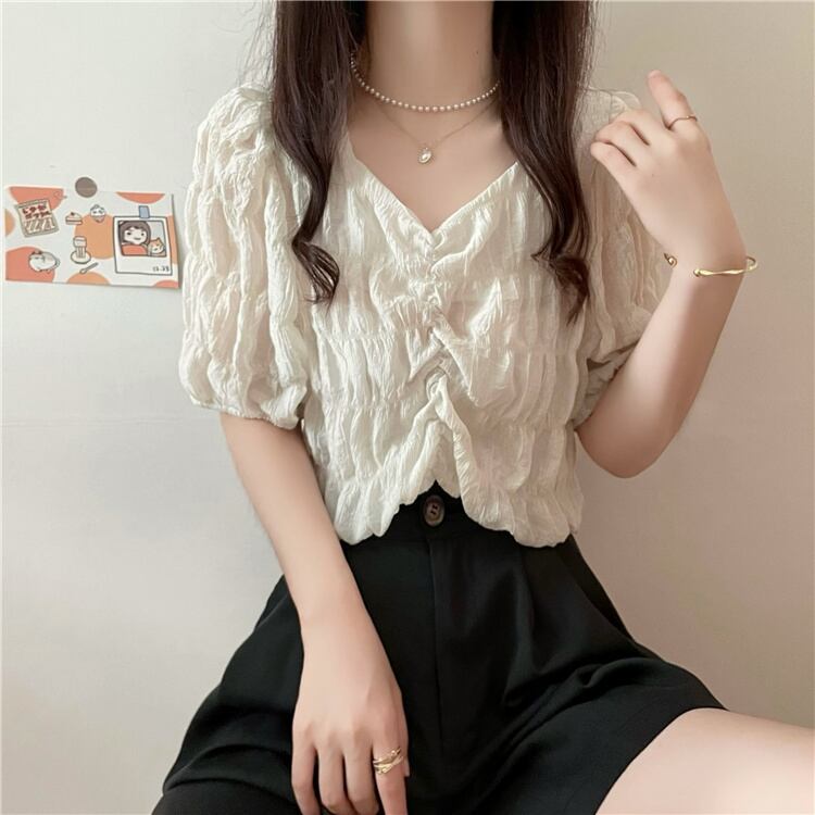 サマースタイルVネックスリーブプリーツシャツ トップス レディース 夏物 ハンチェンe39575791905