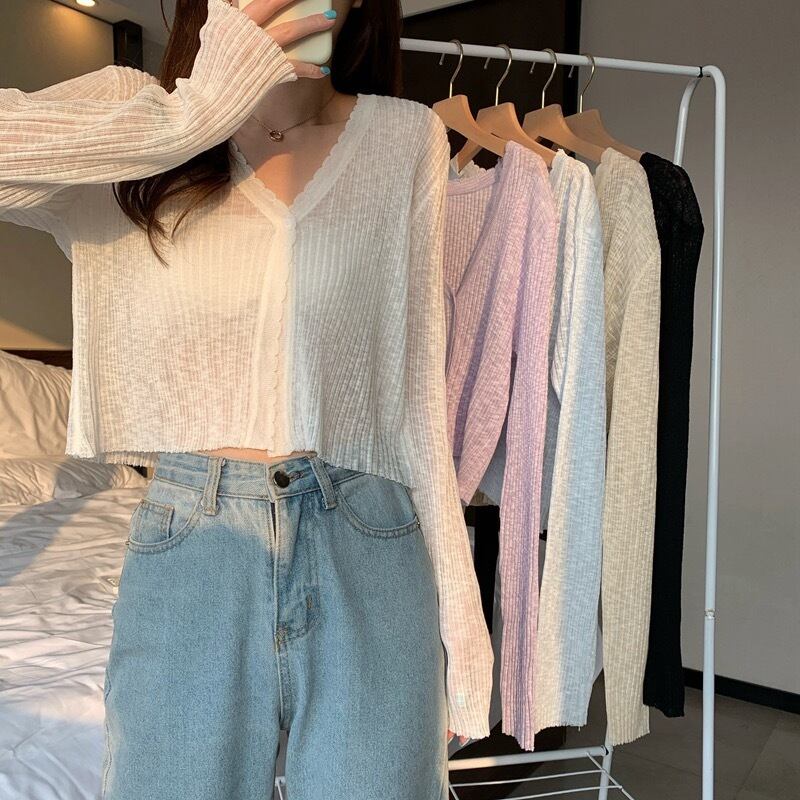 薄手ニットカーディガンサマースタイルVネックシャツ ショートブラウス レディース ロング 夏物 ハンチェンe7197223577
