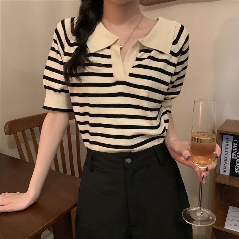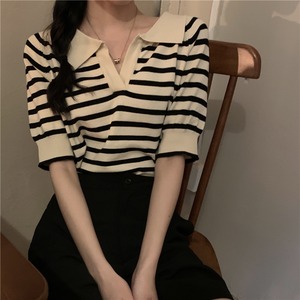 サマースタイル薄手ストライププルオーバー ニットトップス レディース 夏物 ハンチェンe64256010779