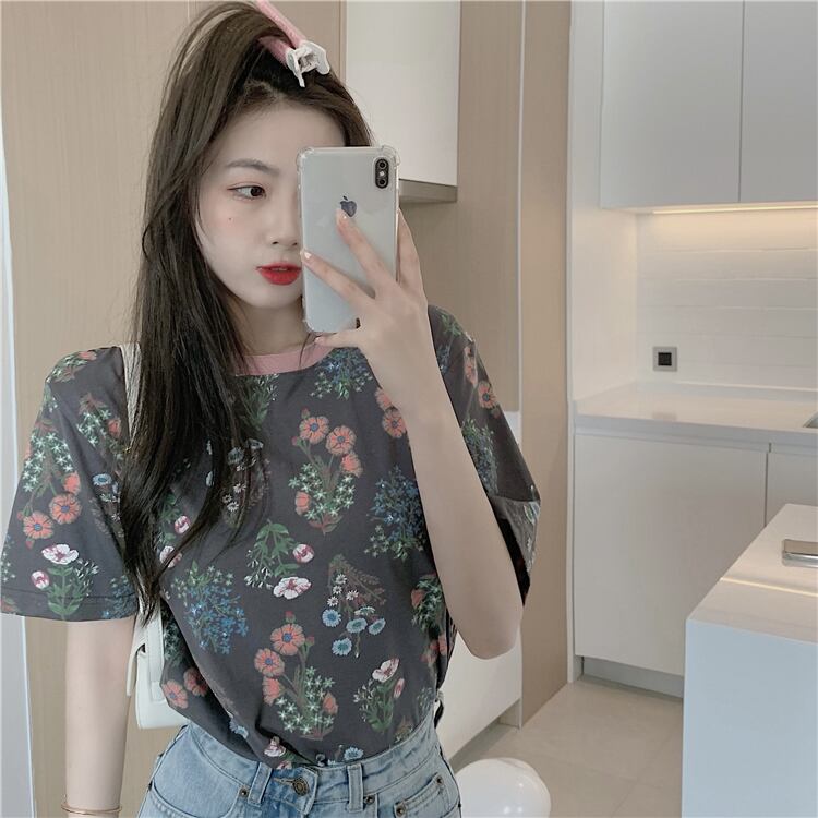 サマースタンダードラウンドネックルーズ薄手カラープリントTシャツ トップス レトロ 夏物 Oネック ハンチェンe58872920899