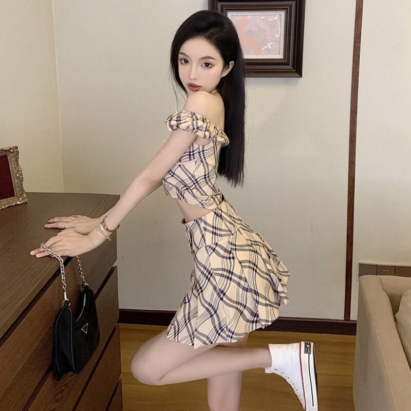 色:チェック柄トップ,短いスカート