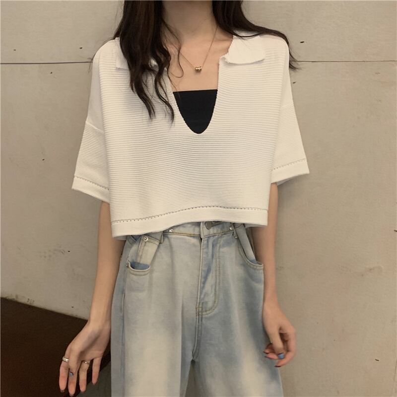 サマープルオーバー ショートセーター Vネックトップス レディース 夏物 ハンチェンe41353920214