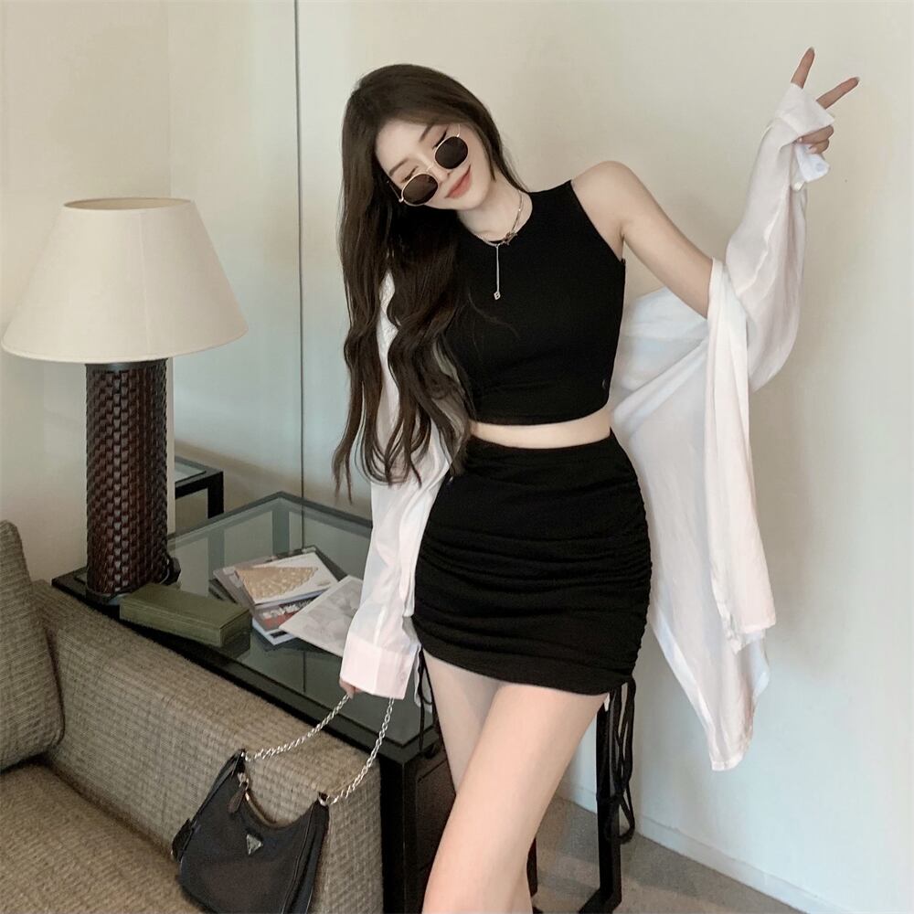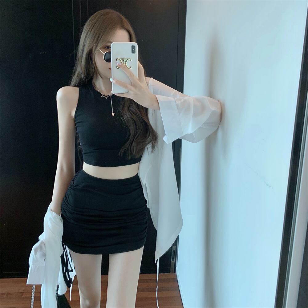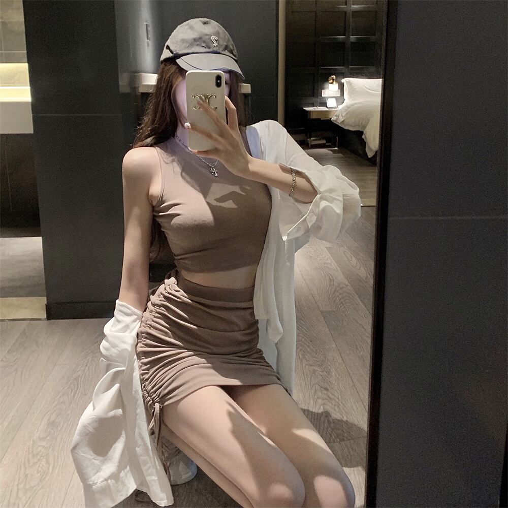 ラウンドネックショートノースリーブハイウェストウェストギャザースカート ジャケット オータム ロング 半袖 ハーフスリーブ 秋物 Oネック ハンチェンe33456892830
