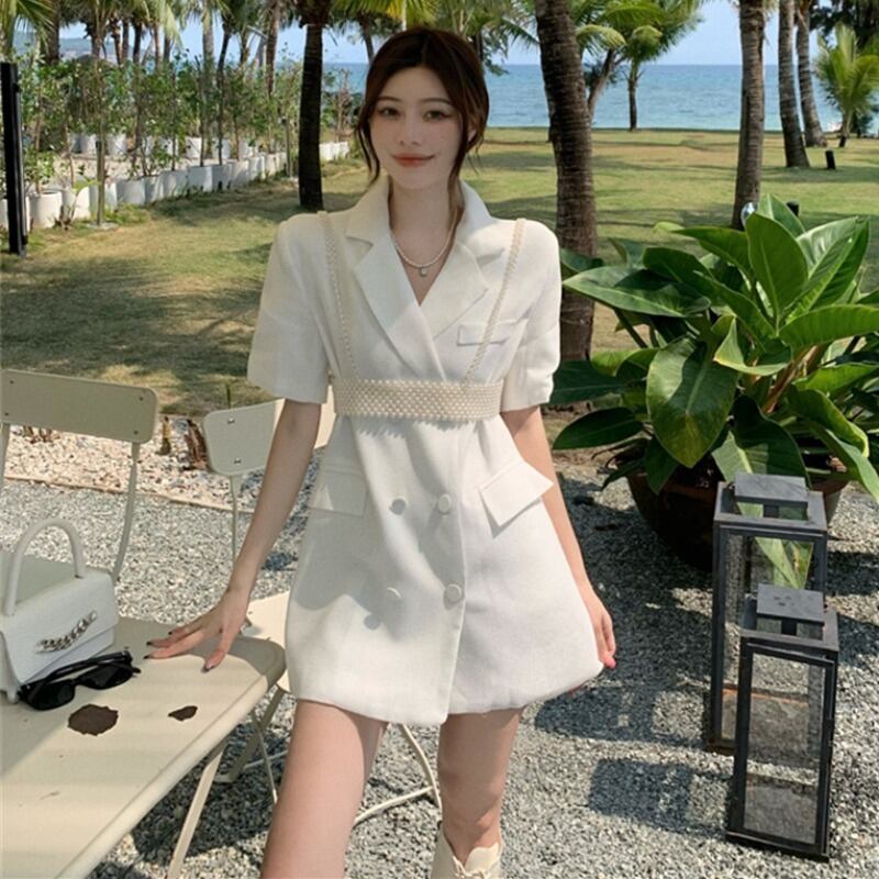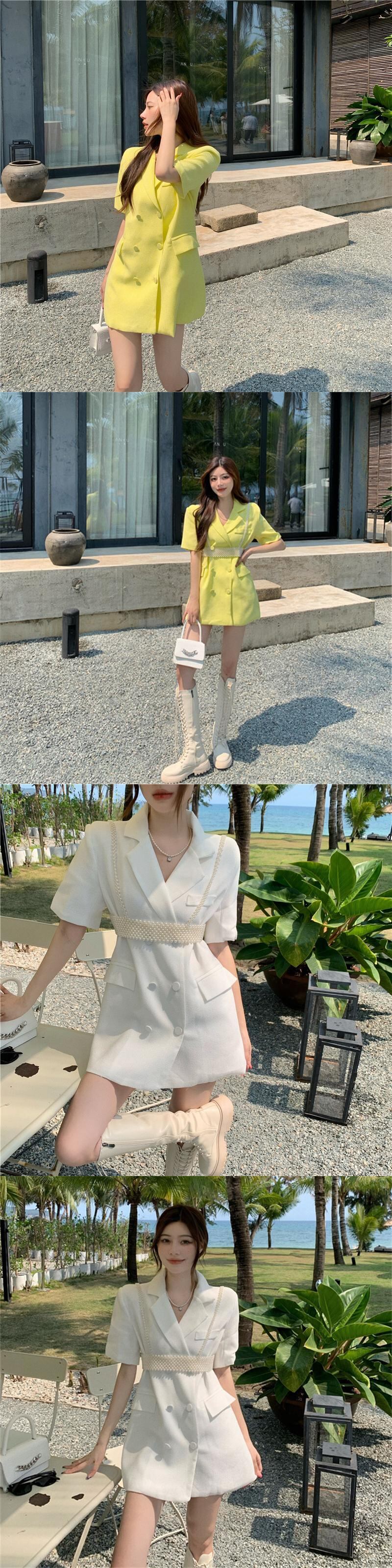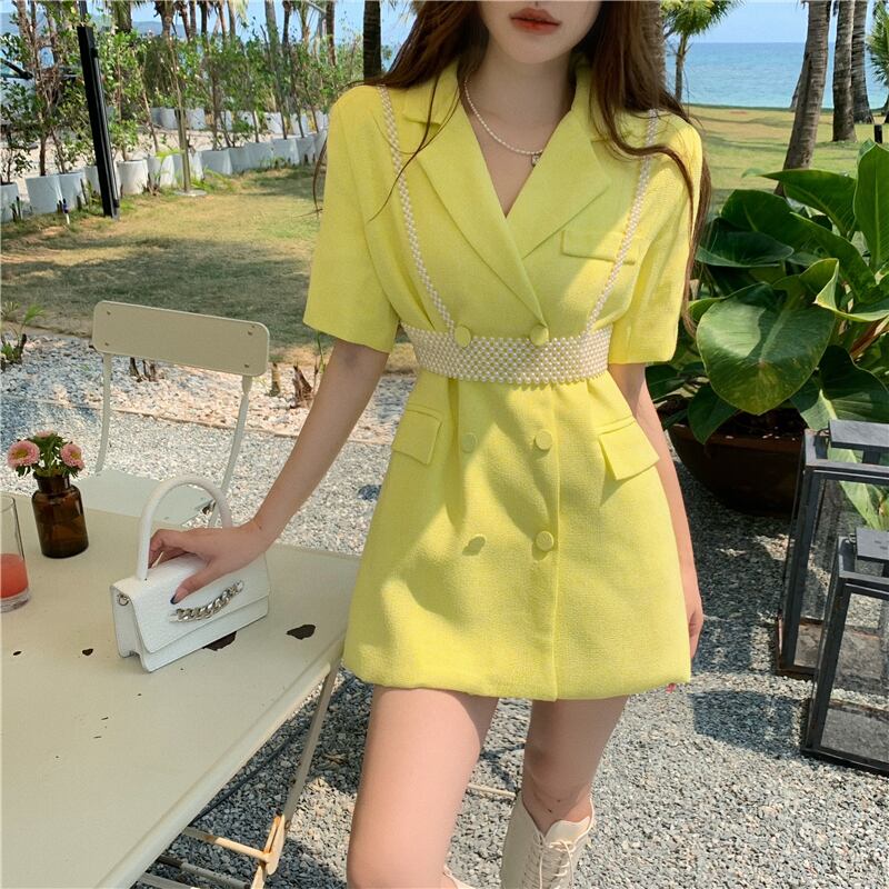色:パールベスト,白いスーツのスカート,黄色のスーツのスカート