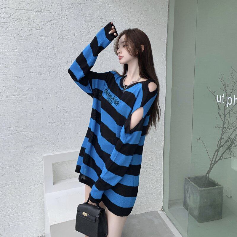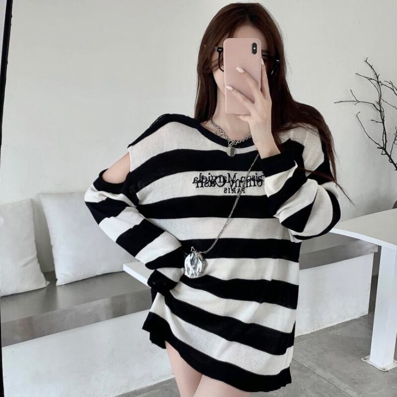 オータムブラックホワイトストライプルーズニットセーター トップス Tシャツ レディース 秋物 ハンチェンe26383846727