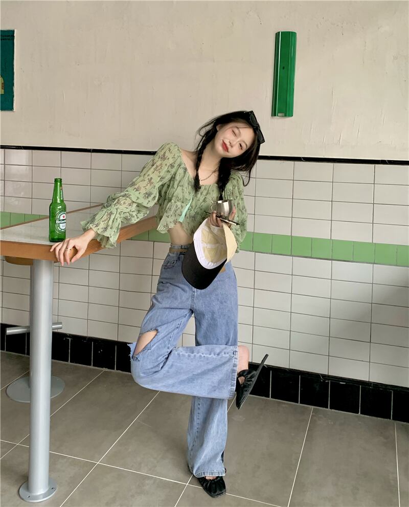 オータムフローラルハイウェストウェストショートシャツ メッシュレディース ロング 秋物 花柄 ハンチェンe82052335493