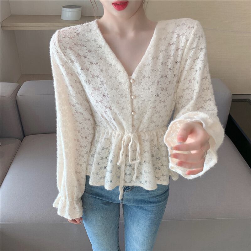 Vネックレースシャツ オータムギャザートップス ロング 長袖 秋物 ハンチェンe39385273552