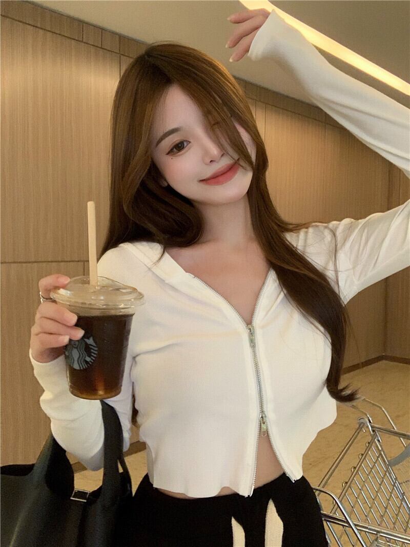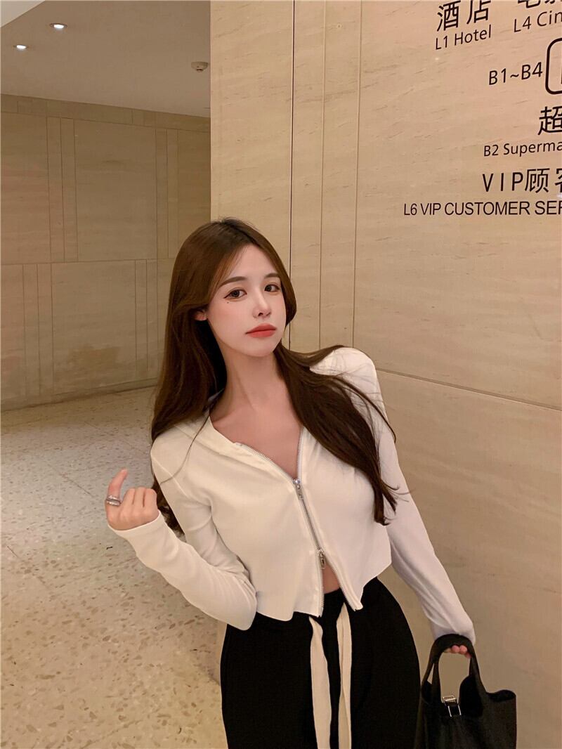 フードジッパーTシャツ オータムクロップドショートトップス ロング 秋物 ハンチェンe85562300483