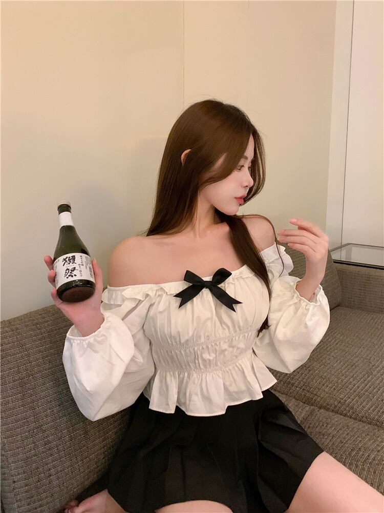 オータムカラープリーツシャツ リボンスリムショートトップス ロング 秋物 ハンチェンe45780365035