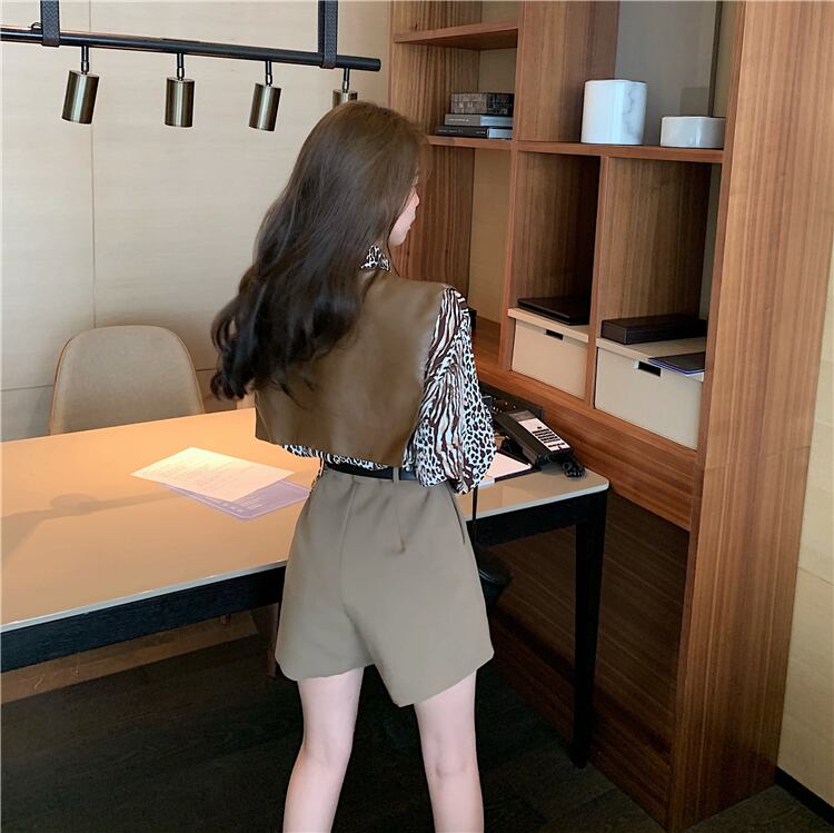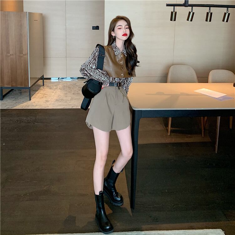 レオパードプリント柄シャツ スタイルレザーハイウェストウェストショーツ ベルト オータム 秋物 ハーネス ブルマー ハンチェンe46300660787
