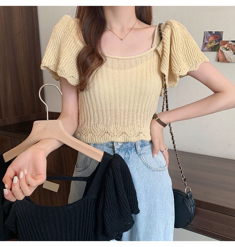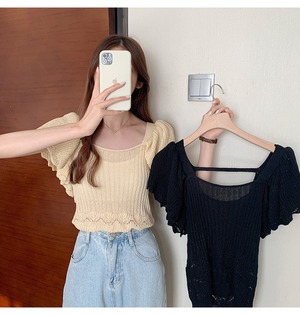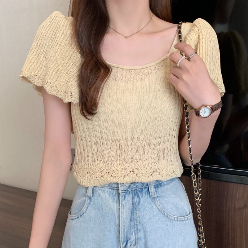薄手ニットセーター スタイルカラーソリッド クロップドトップス レディース シルク ソリッドカラー スクウェア ハンチェンe44015828789