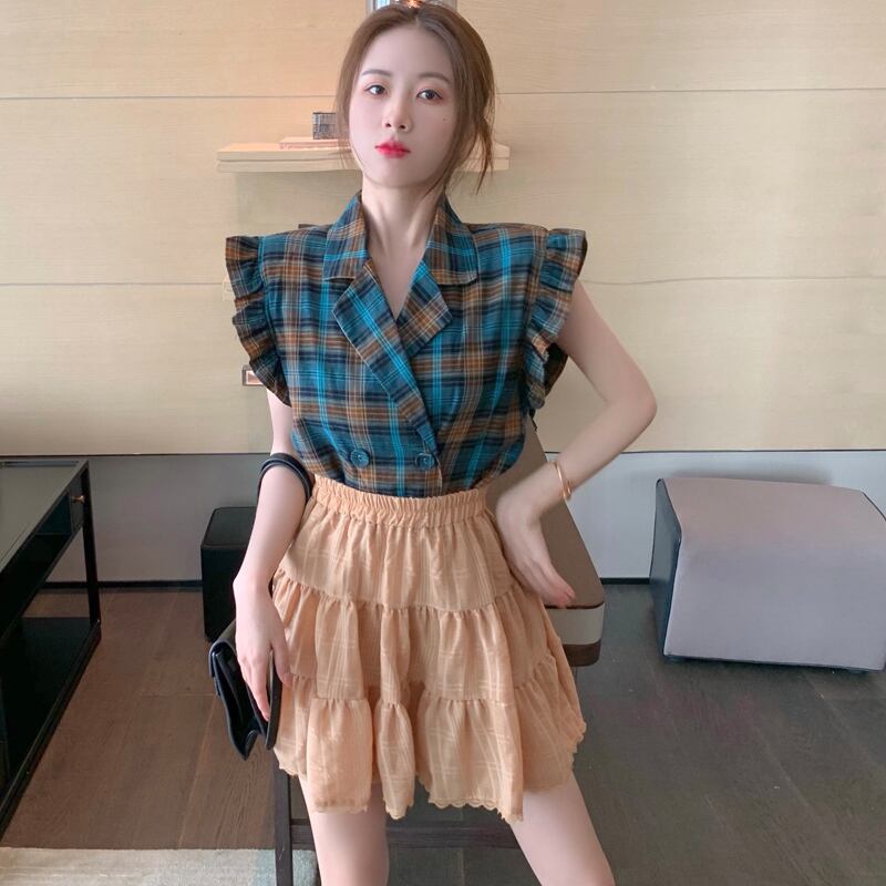 格子柄カラーシャツ ウェストAラインショートスカート 大人ガーリー スウィート キュート カジュアル ハンチェンe16044644550