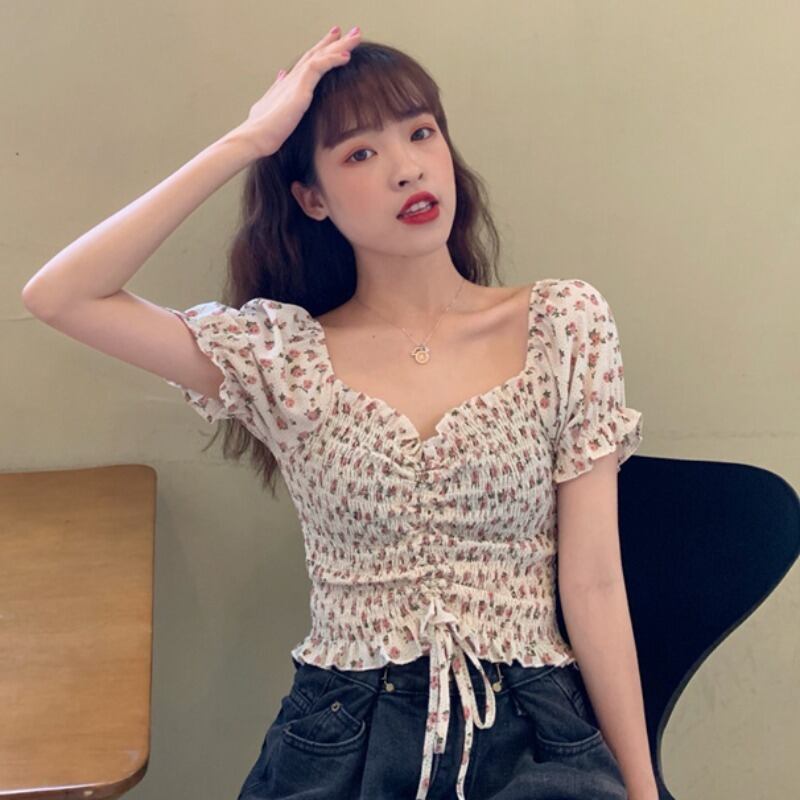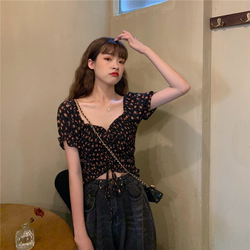 フローラルシャツ サマースリーブスリムクロップドトップス 夏物 花柄 スクウェア ハンチェンe80661886015