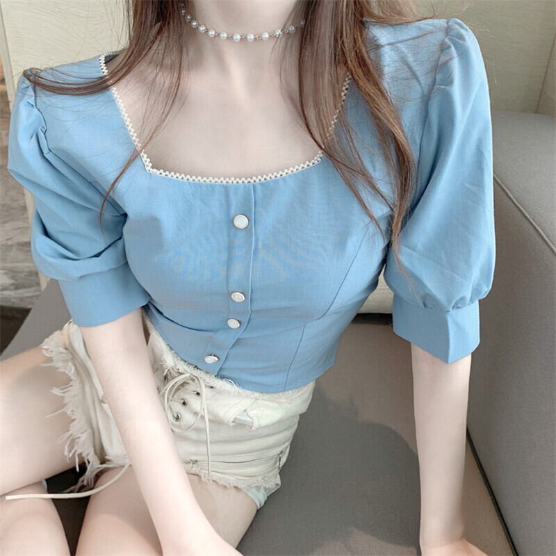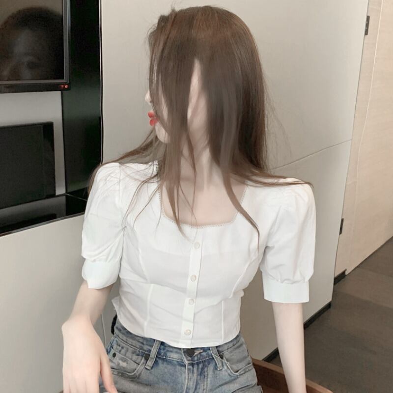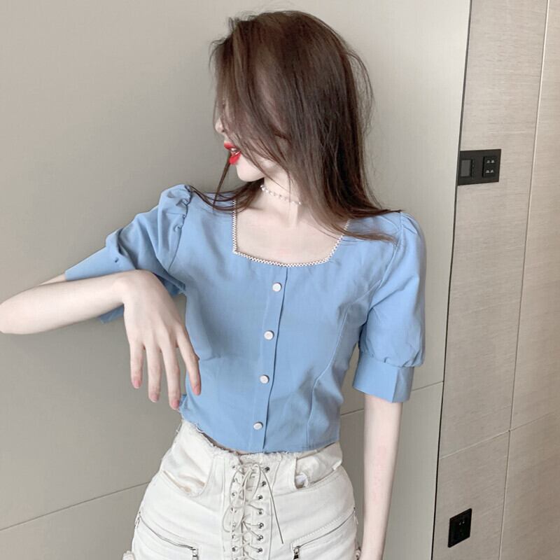 サマーシャツ パールスリーブショートトップス 夏物 真珠 スクウェア ステッチ ハンチェンe95450541436