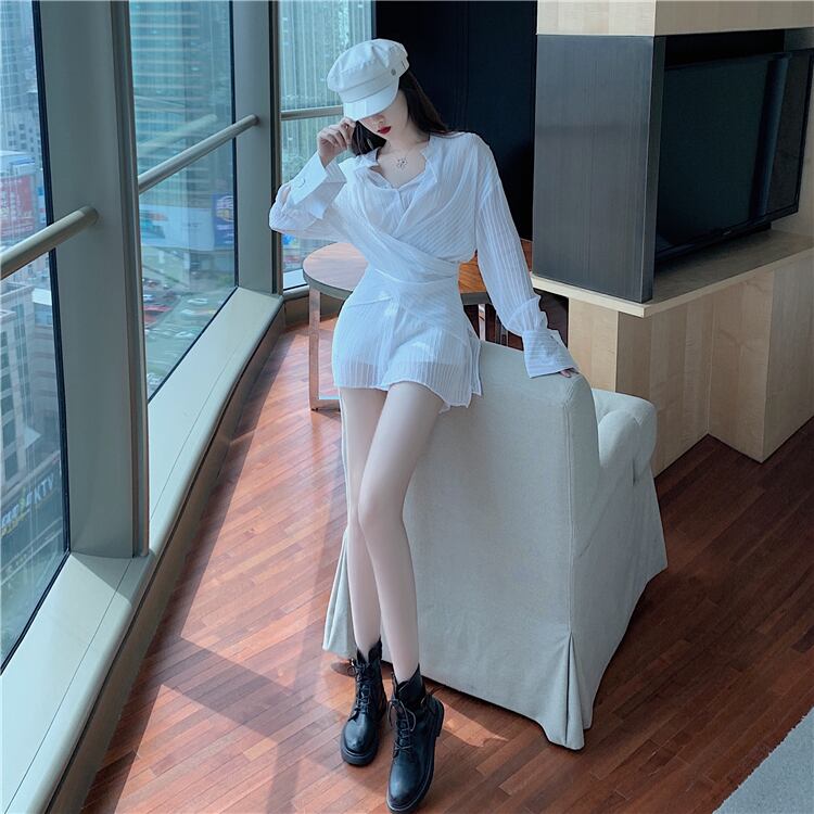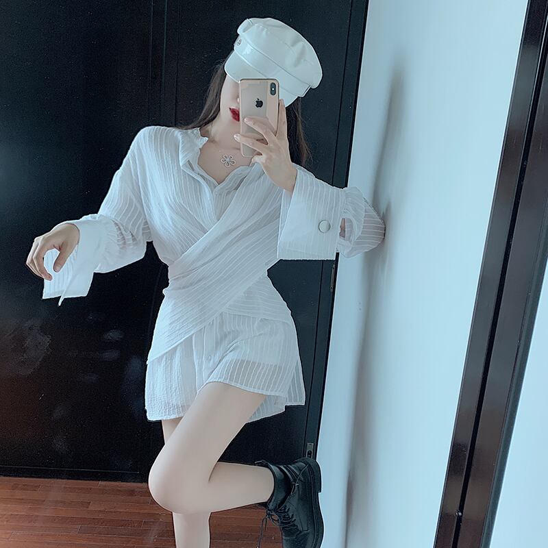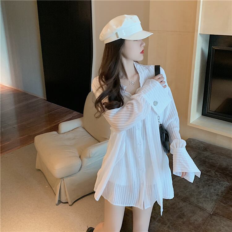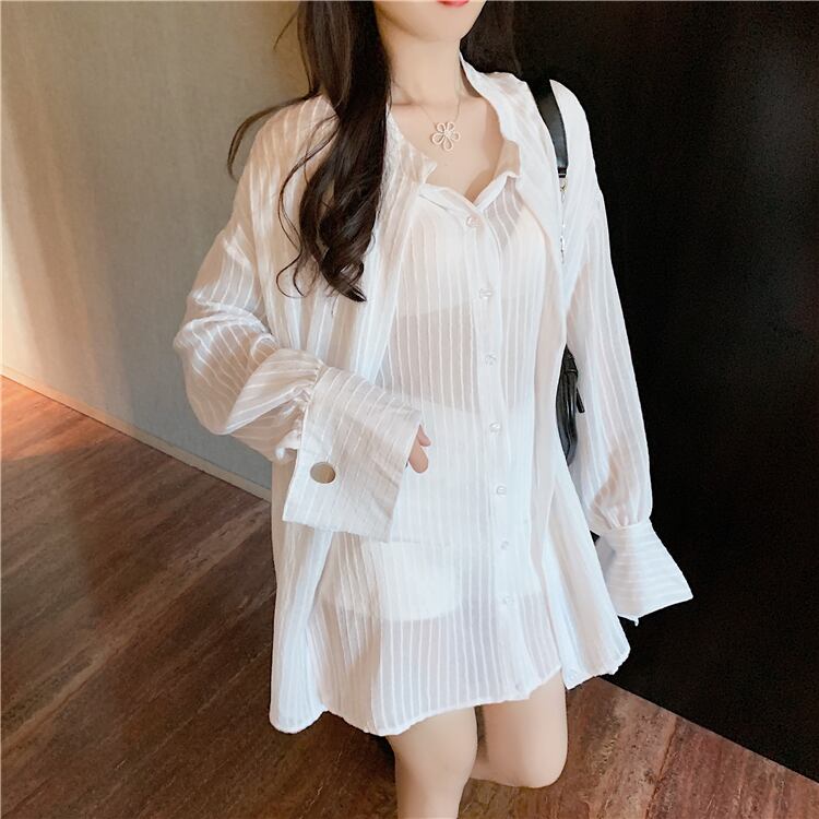 オータムルーズシャツ ホワイトストライプ 秋物 ハンチェンe38287223762