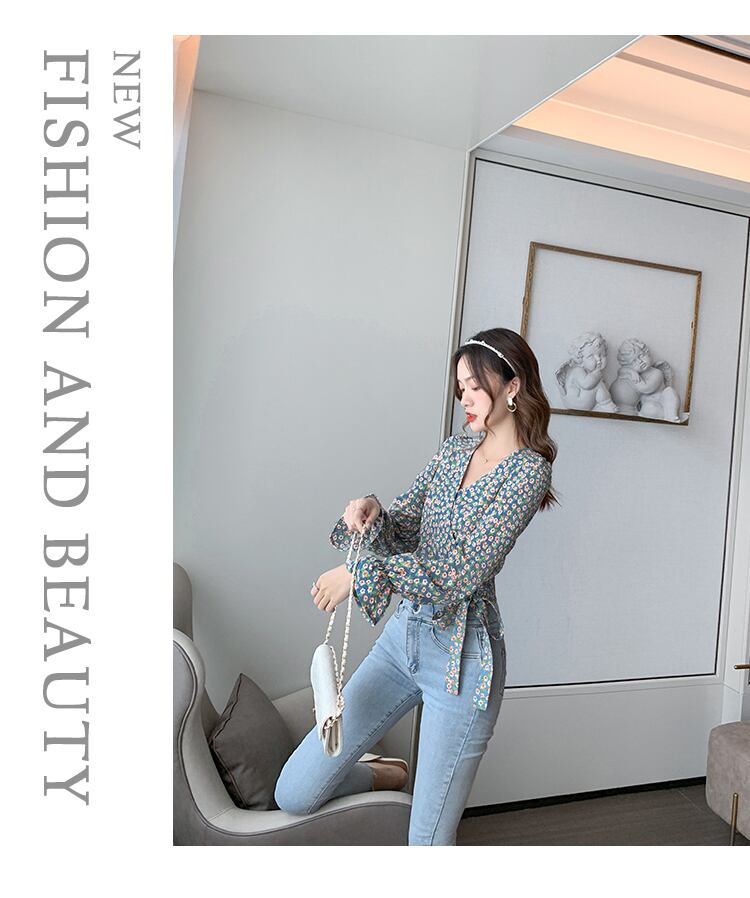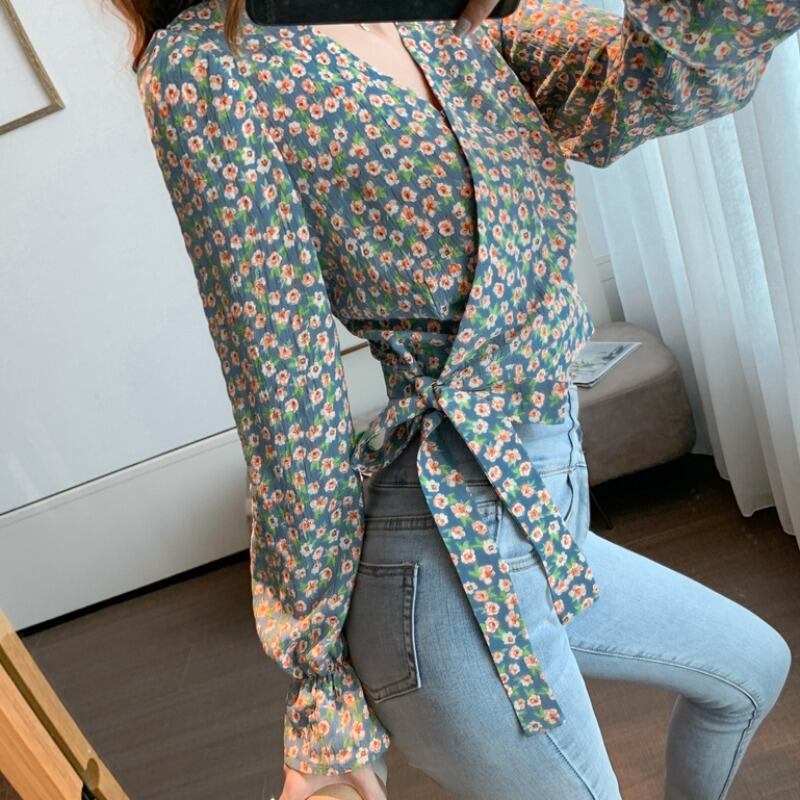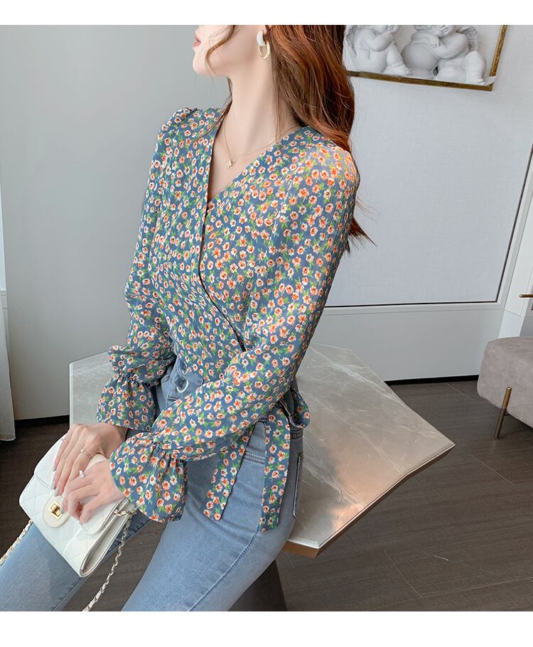 オータムVネックスタンダードクロップドトップス シャツ シフォン レトロ 秋物 ハンチェンe93090054474
