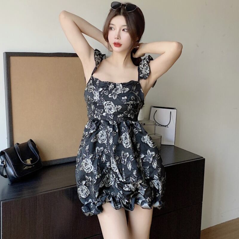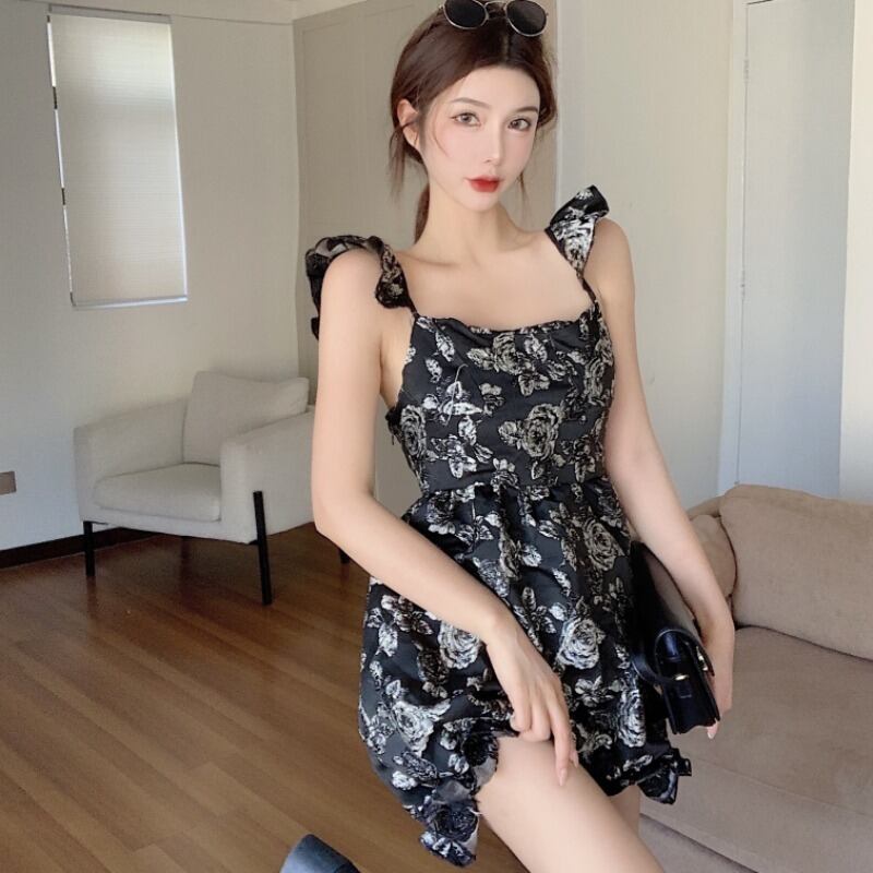 スタンダードスタイルブラックドレス ウェスト薄手レディース レトロ ハンチェンe32006127023