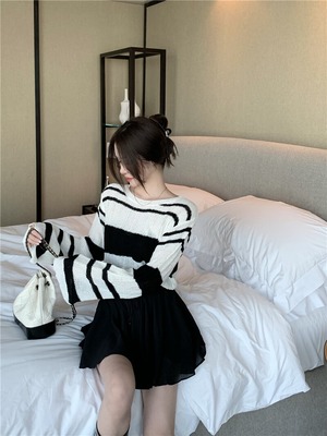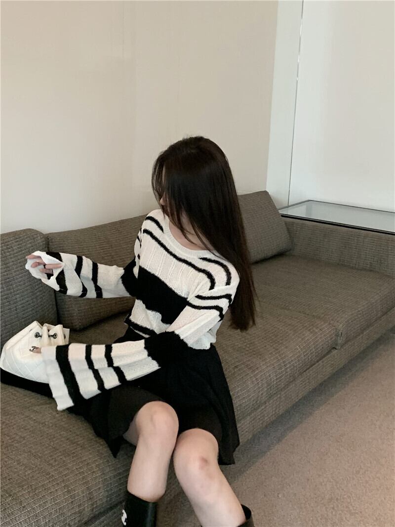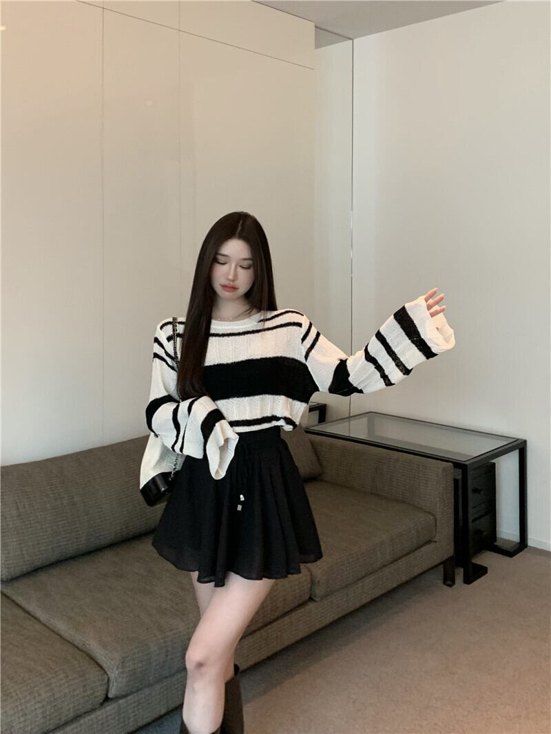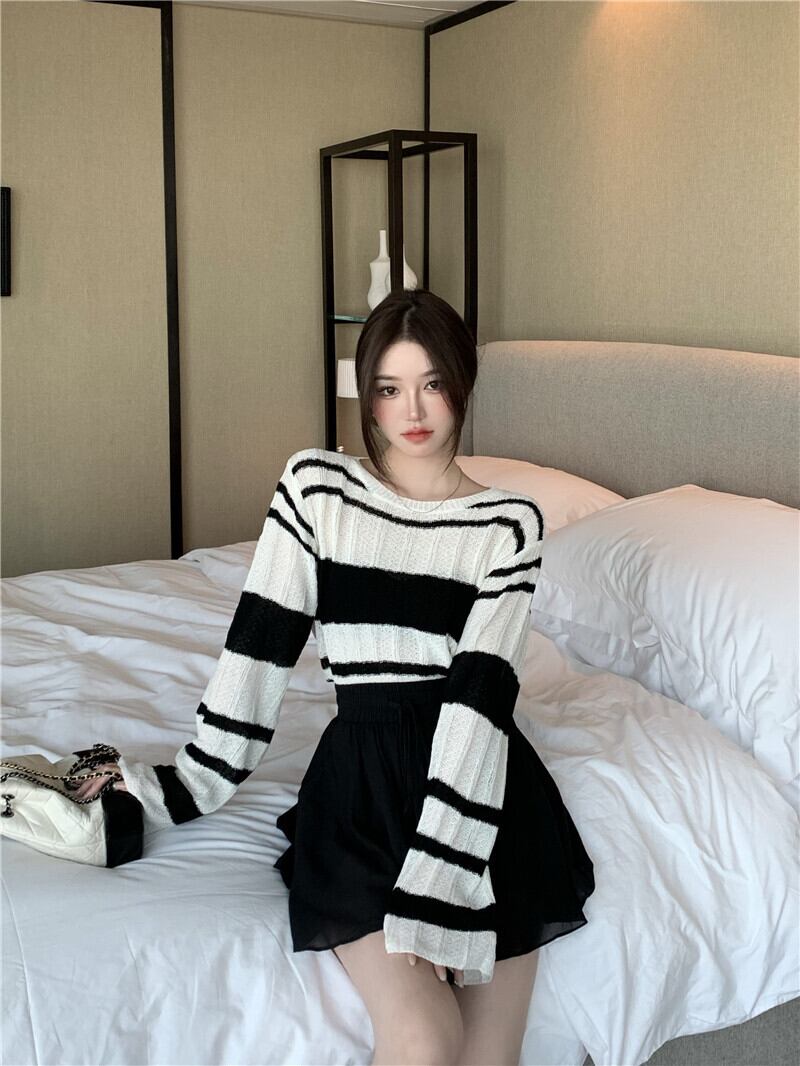 スリーブルーズストライプニットトップス ウェストシフォンスカート レッド ハンチェンe11770702913