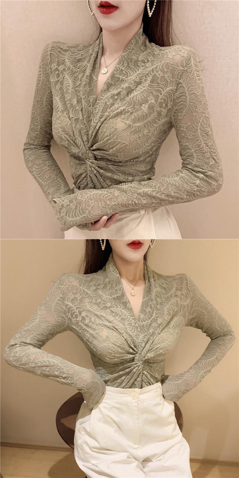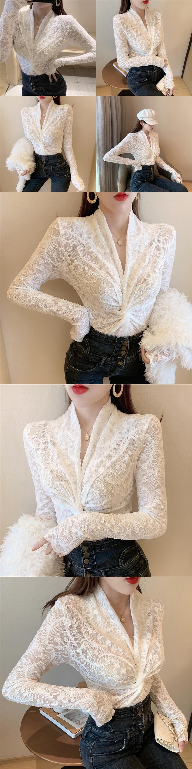 クロスVネックレースシャツ オータムトップス ロング 秋物 ハンチェンe68539114492
