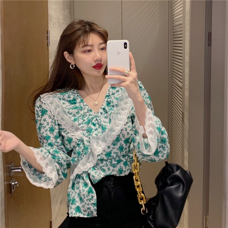 オータムスタンダードVネックレースシフォンシャツ ブラウス ロング レトロ 秋物 ステッチ ハンチェンe71918647776