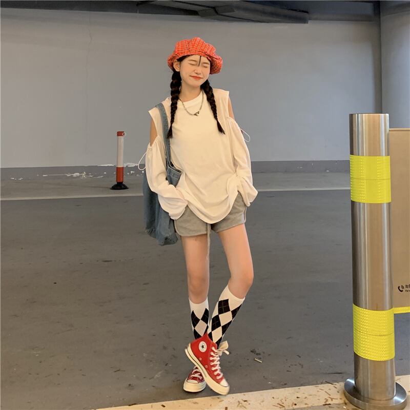 ルーズギャザーストラップレスTシャツ オータムジャケット ロング コットン 秋物 ハンチェンe83486470751