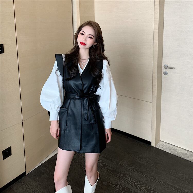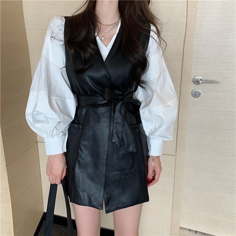 オータムスタイルルーズシャツ バンドウェストレザー 秋物 ハンチェンe55406985171