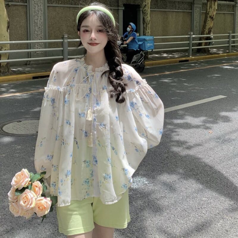 オータムフローラルシャツ ルーズシフォンブラウス レディース ロング 秋物 花柄 ハンチェンe73682956696