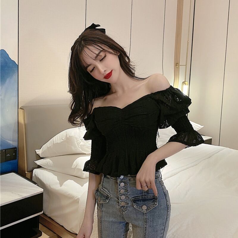 オータムハイウェストウェストショートクロップドレースシャツ Vネックソリッド カラースリーブトップス レディース 秋物 ソリッドカラー ハンチェンe71511062432