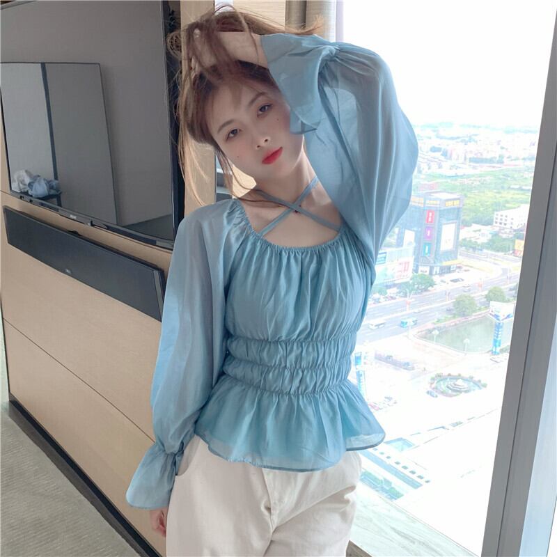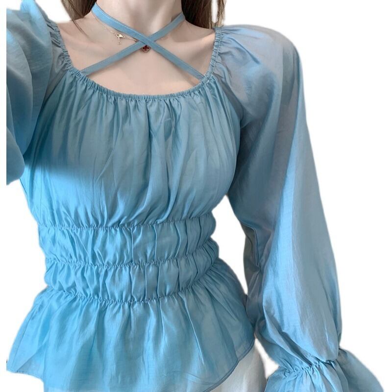 ソリッド カラーシャツ オータムドレス ウェスト薄手スタイルスリーブトップス 秋物 ソリッドカラー ハンチェンe69131284598