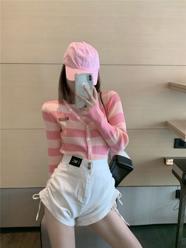 スリムフィットストライプVネックセーター トップス ハイウェストショーツ スタイルスプリング 春物 ブルマー ハンチェンe46837583661
