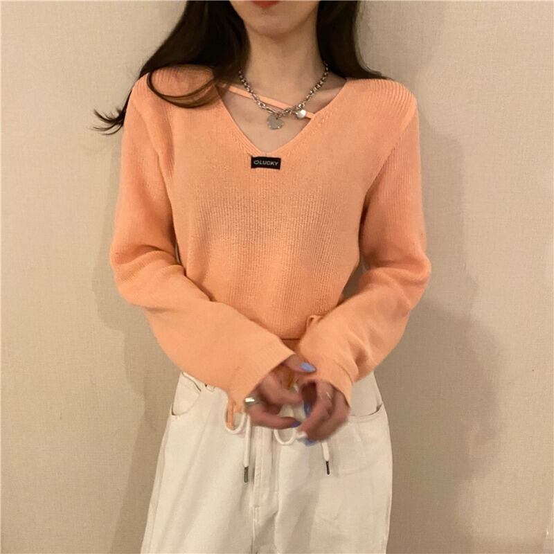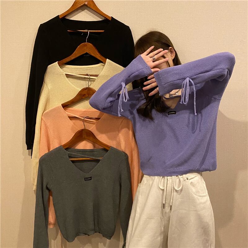Vネックニットセーター オータムスリムレッドトップス ロング 秋物 ハンチェンe425884529