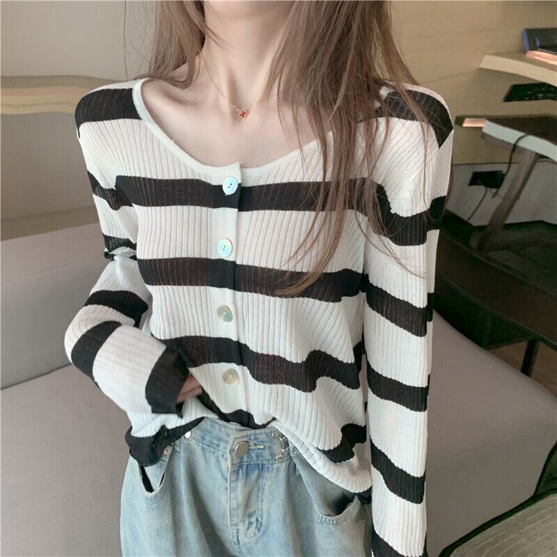 ブラックホワイトストライプラウンドネックセーター オータムトップス レディース ロング 秋物 Oネック ハンチェンe32789771351