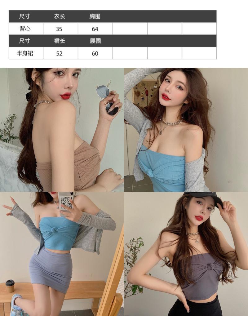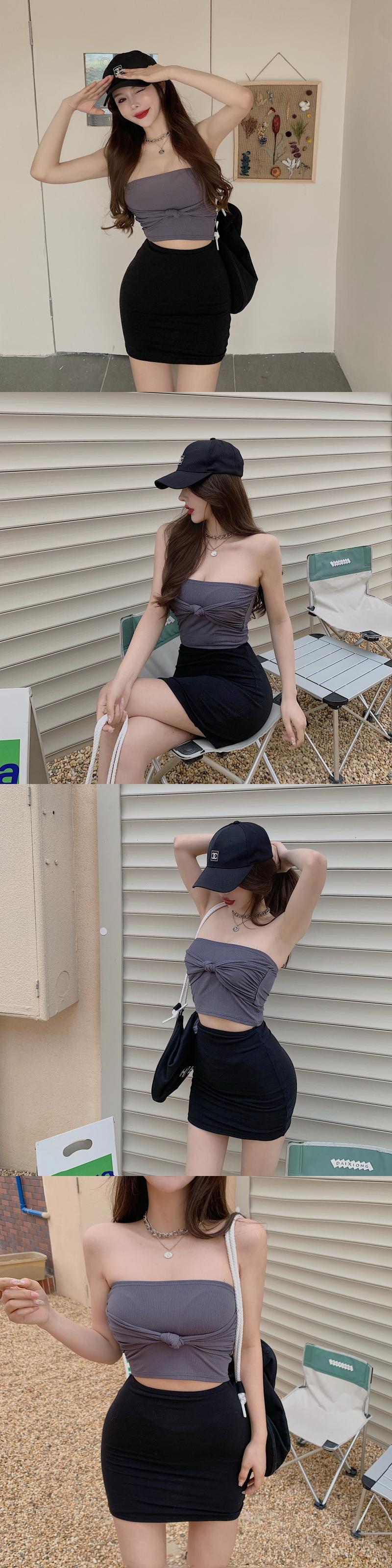 色:カーキチューブトップ,レイクブルーのチューブトップ,グレーのチューブトップ,カーキ色のスカート,黒スカート,グレースカート