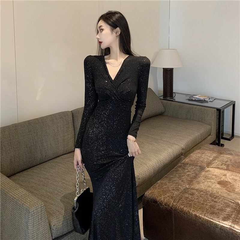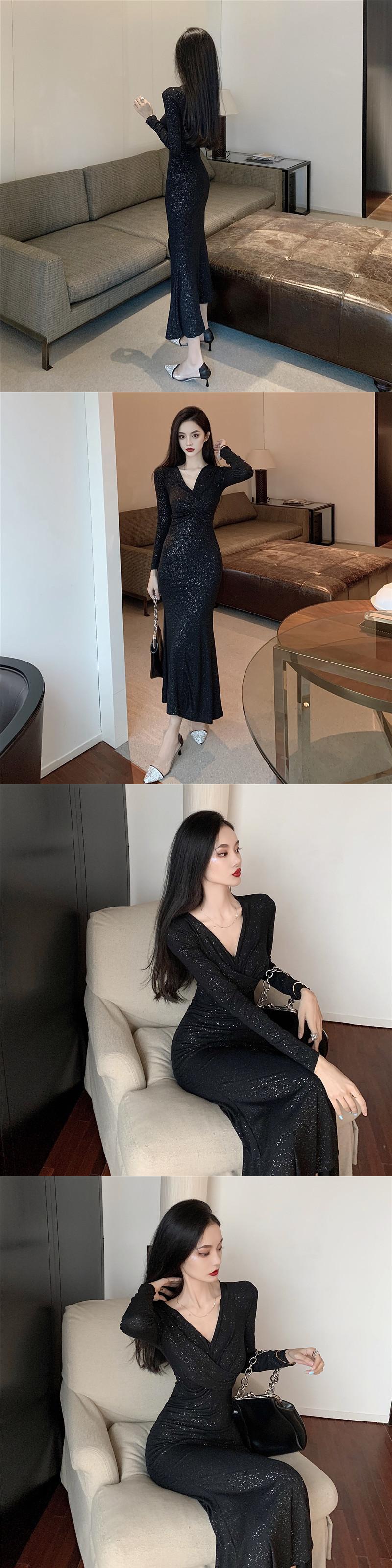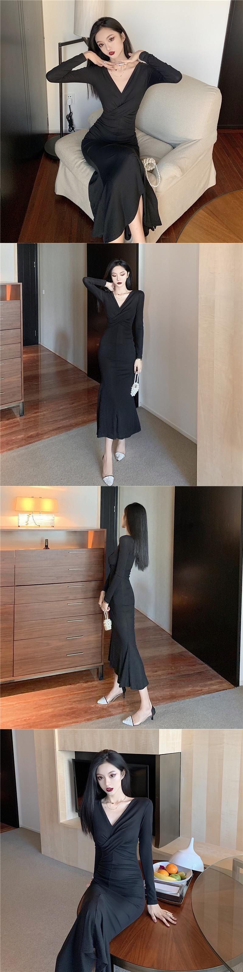 オータムVネックウェスト薄手スカート ロング 長袖 秋物 ハンチェンe86687169418