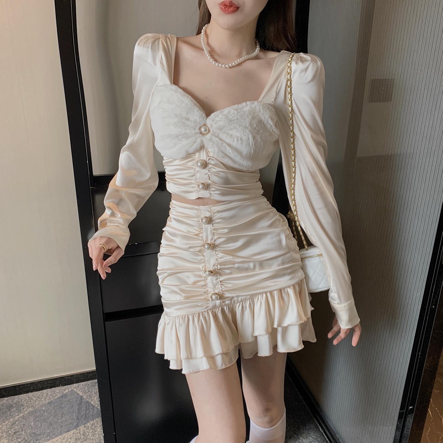 セット オータムショートクロップトップ トップス プリーツスカート 秋物 ハンチェンe67138112535