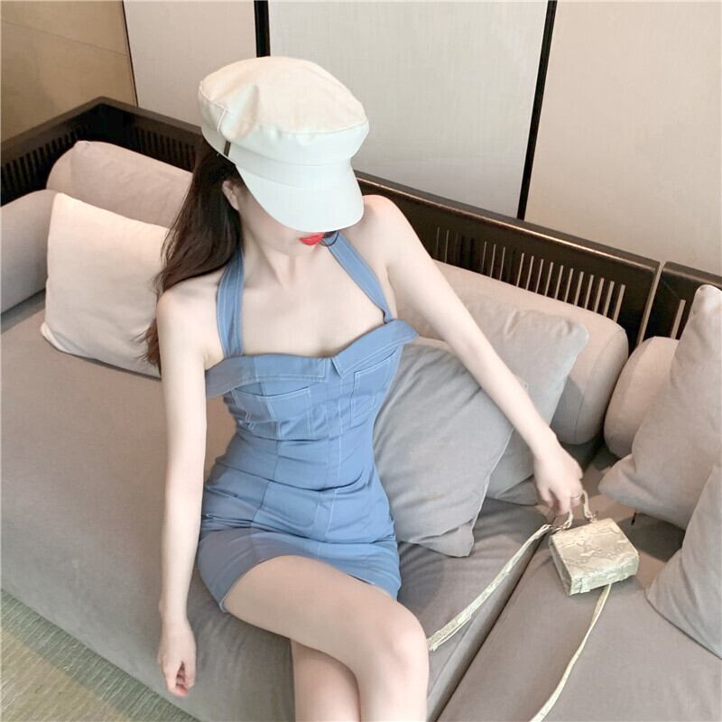 サマーブルーハイウェストウェスト薄手ドレス ストリート 夏物 ハンチェンe41608031607
