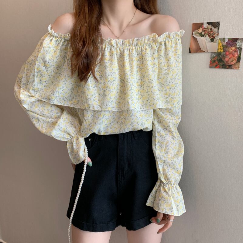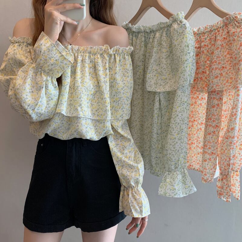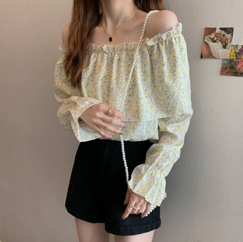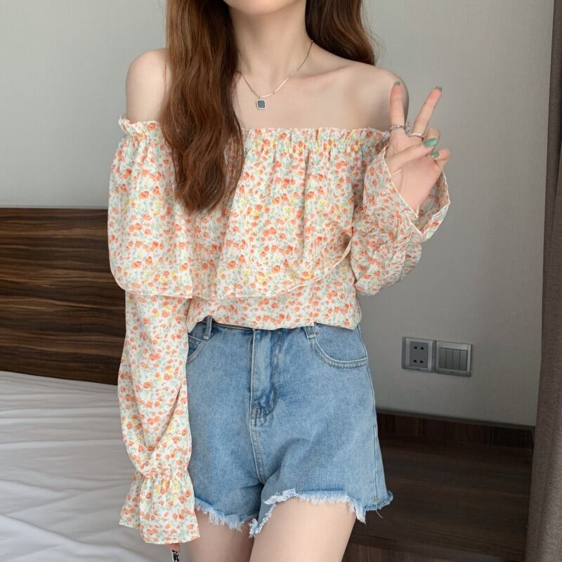 シフォンシャツ オータムカラーストラップレスフローラルブラウス レディース 大人ガーリー スウィート キュート カジュアル 秋物 花柄 ハンチェンe21850265109