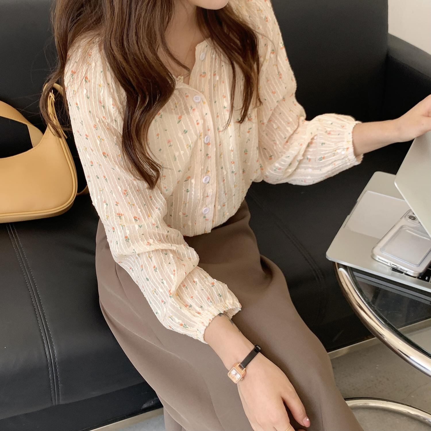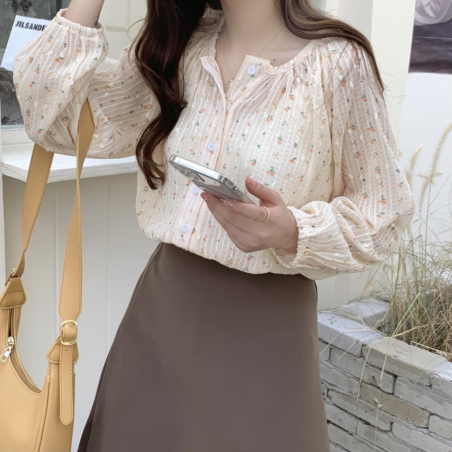 スタンダードフローラルシフォンシャツ オータムスタイルルーズストライプトップス レディース レトロ 秋物 花柄 ステッチ ハンチェンe3620576082