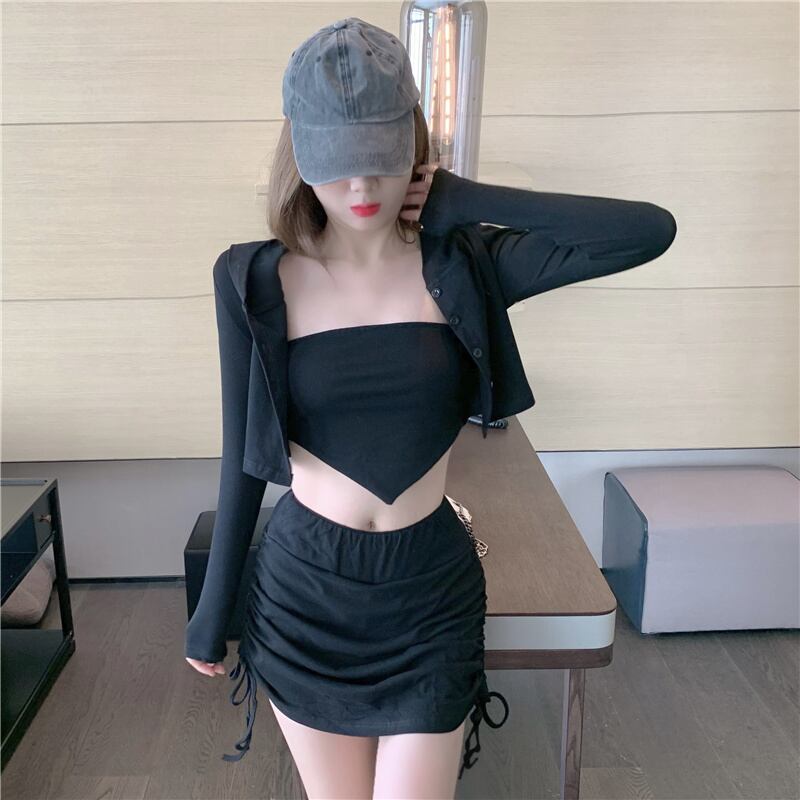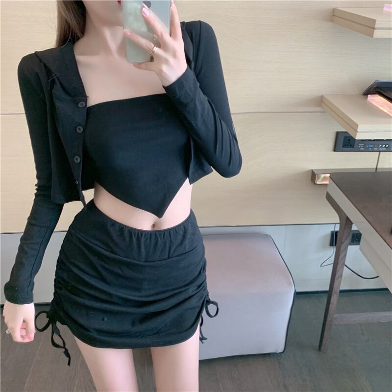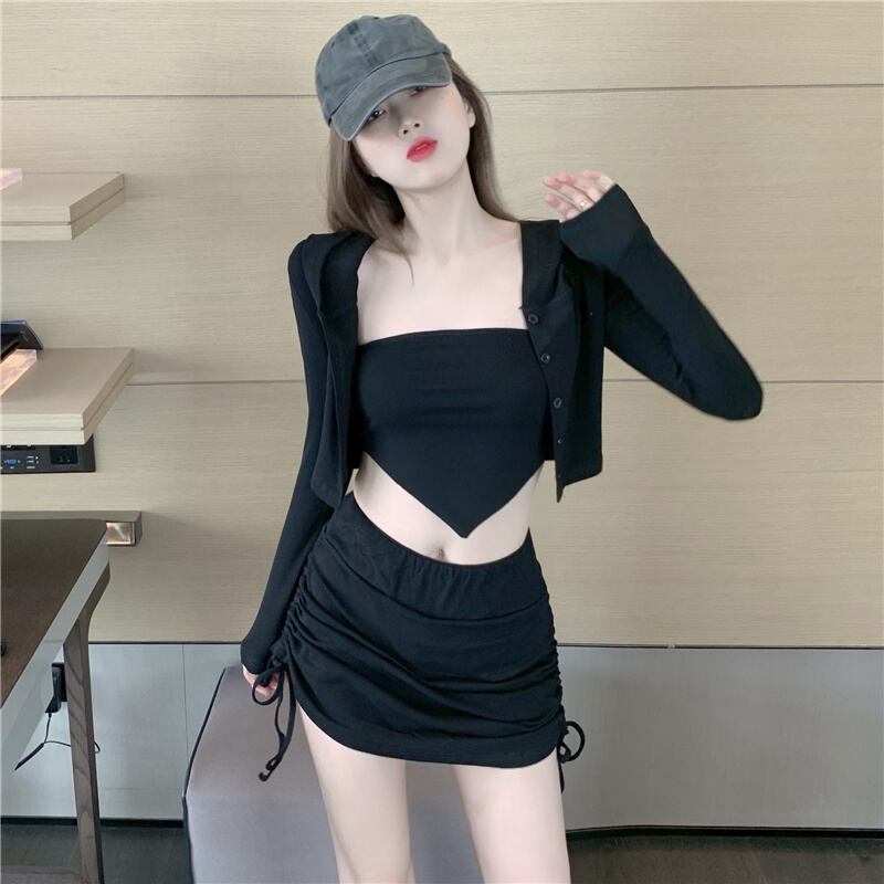 色:灰色の胸ラップ,グレーのカーディガン,グレーバッグスカート,ブラックラップチェスト,ブラックカーディガン,黒スカート