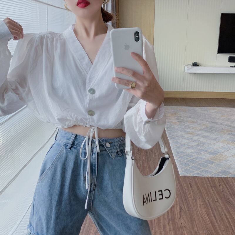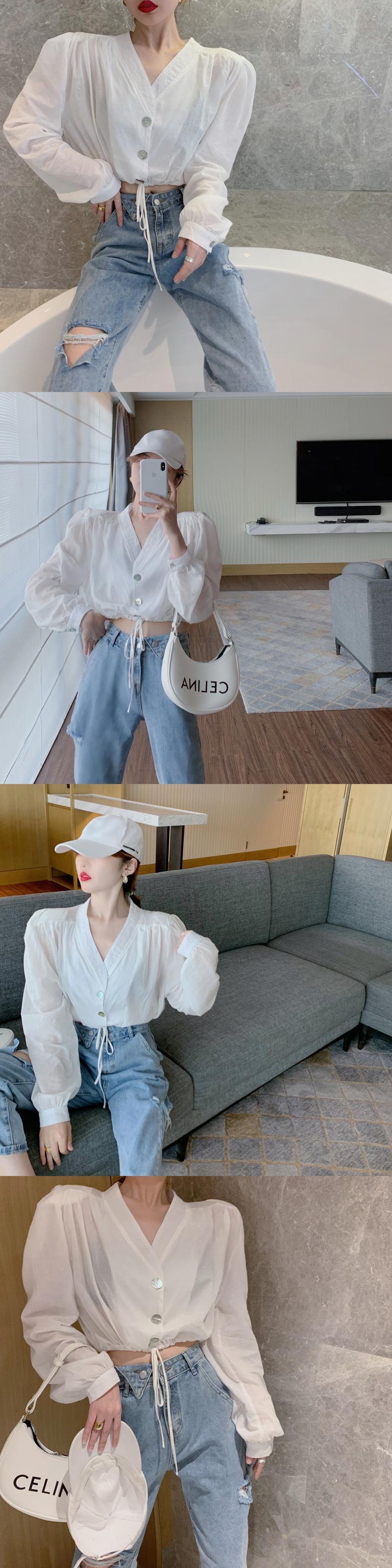 ギャザー薄手Vネックシャツ レディースサマーショートカーディガントップス ロング 夏物 ハンチェンe68162939248