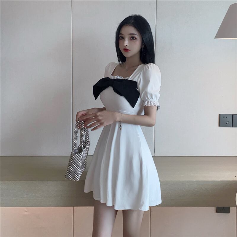 ブラックドレス スリーブレースレディース リボン 大人ガーリー スウィート キュート カジュアル ステッチ ハンチェンe79627510827