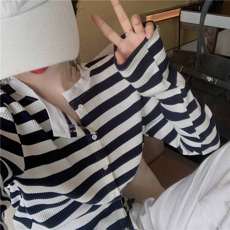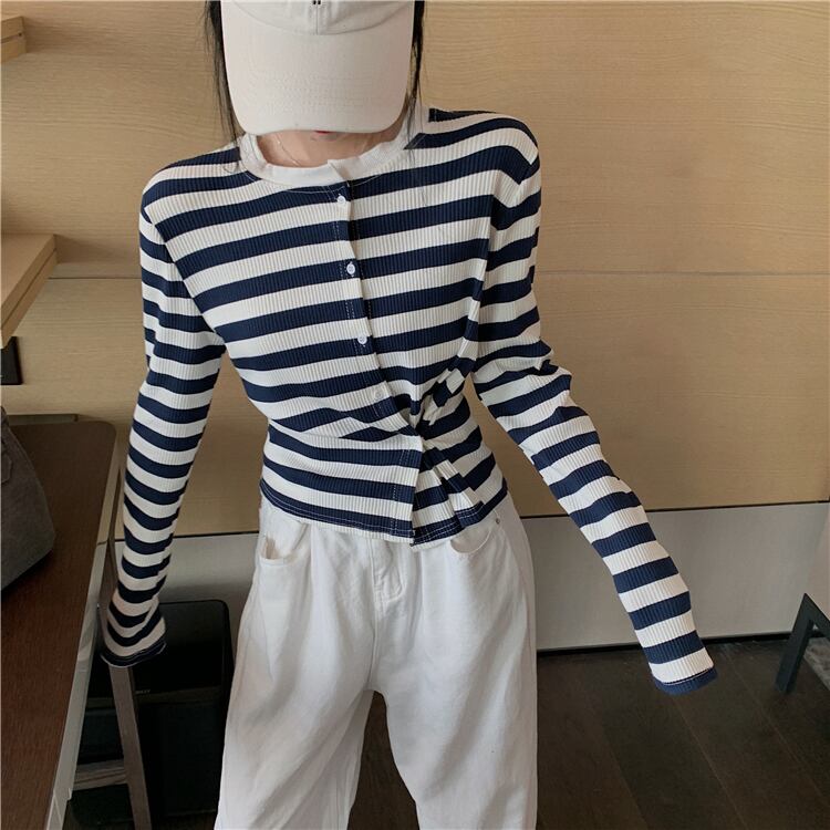 スタイルラウンドネックTシャツ シャツ オータム薄手スタンダードストライプサイドボタンニットカーディガンレディース レトロ 秋物 Oネック ハンチェンe11000911272