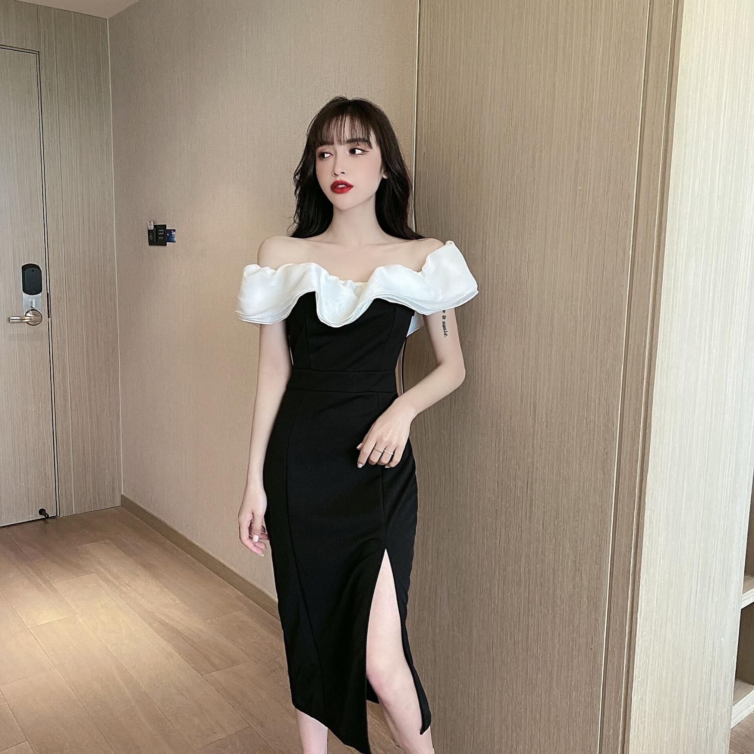 ブラックホワイトスタイルスリットウェストドレス ハンチェンe28773786368