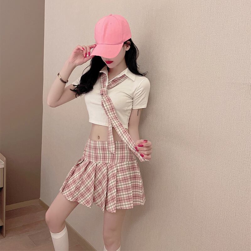 色:ブルーグリッドタイT,ピンクのネクタイT,ピンクのチェック柄スカート,青い格子縞のスカート,ブルースリーピース,スリーピースパウダーグリッド