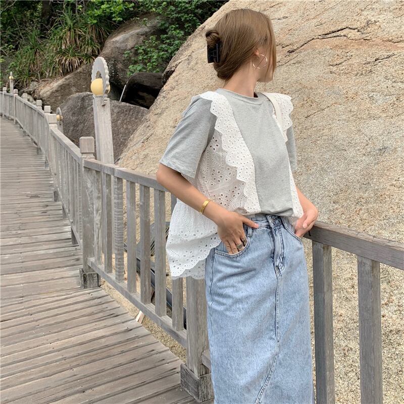 サマースタンダードレースルーズTシャツ トップス レディース レトロ 夏物 ステッチ ハンチェンe66489643586