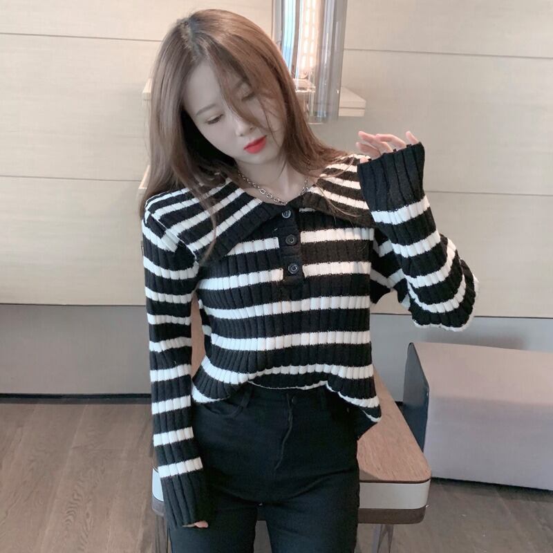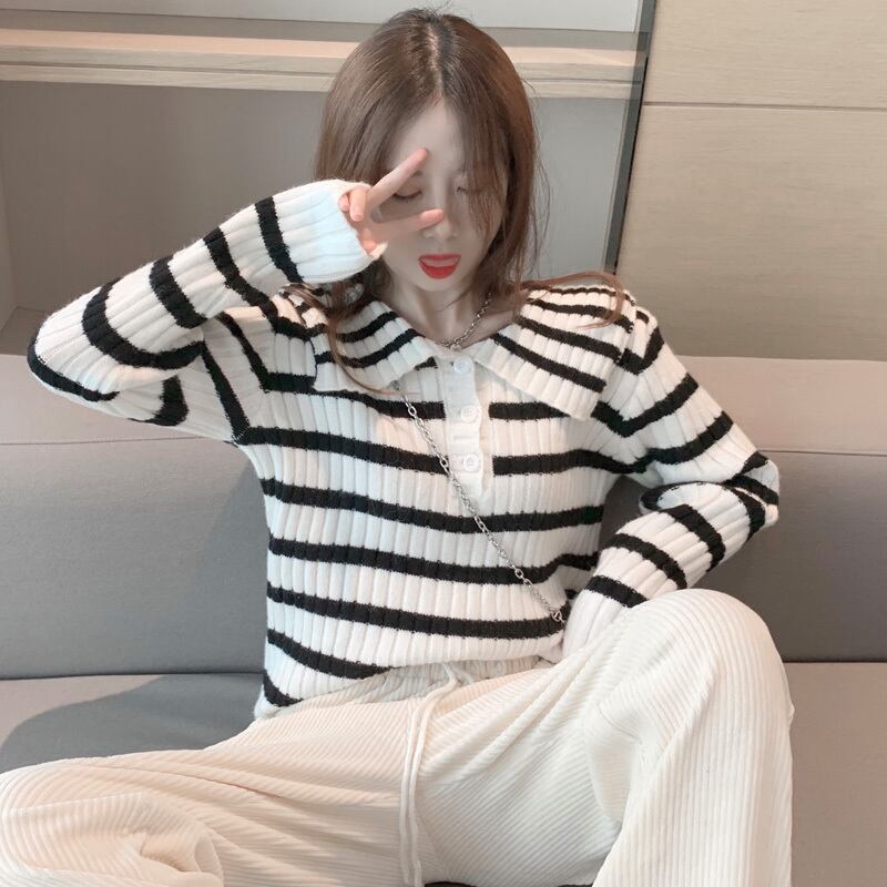 スタイルブラックホワイトストライプセーター ルーズニットトップス ハンチェンe60161494052