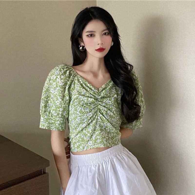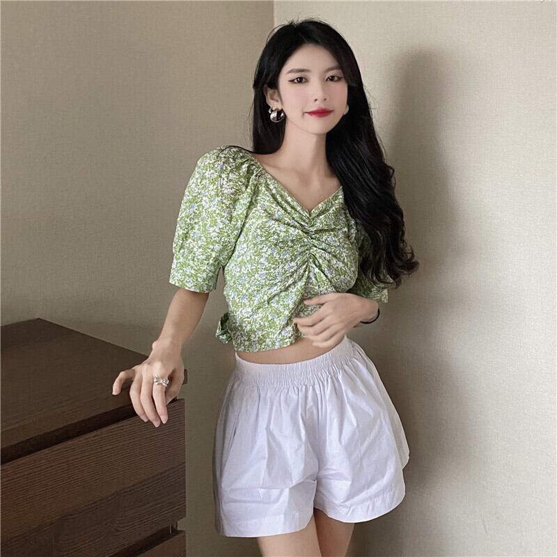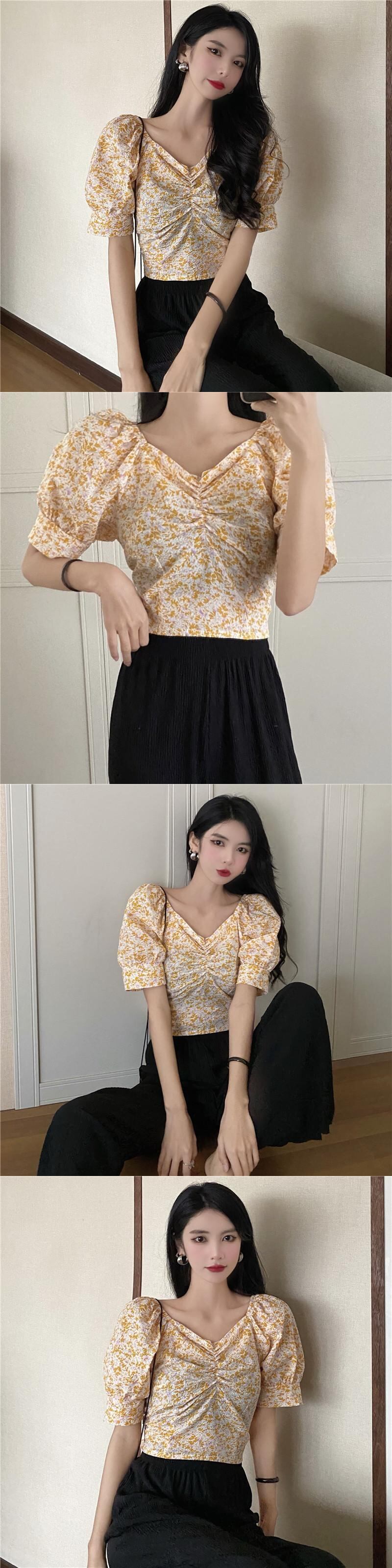 フローラルシャツ サマースタイルスタンダードVネックスリーブショートブラウス レトロ 夏物 花柄 ハンチェンe98956319989