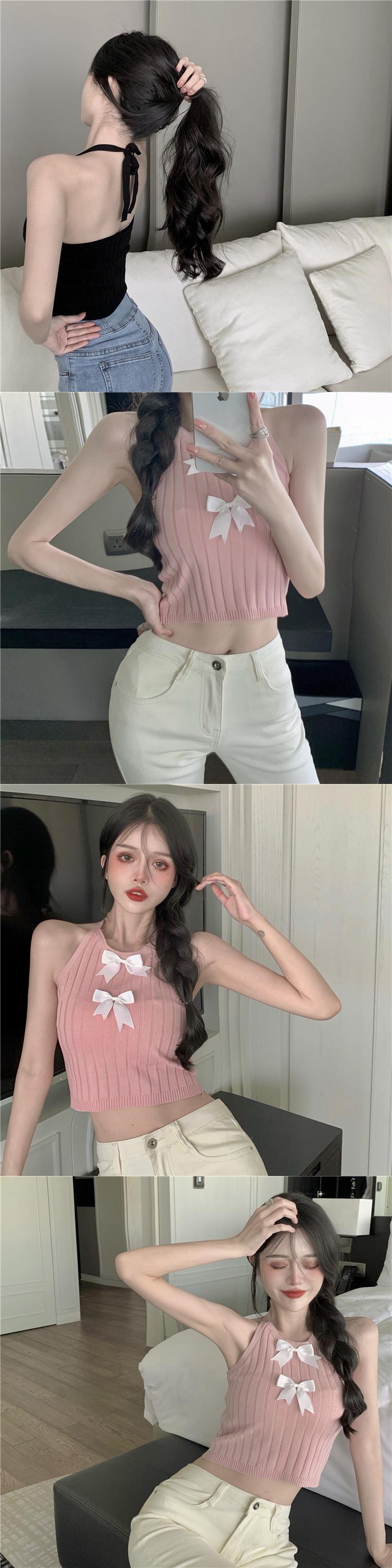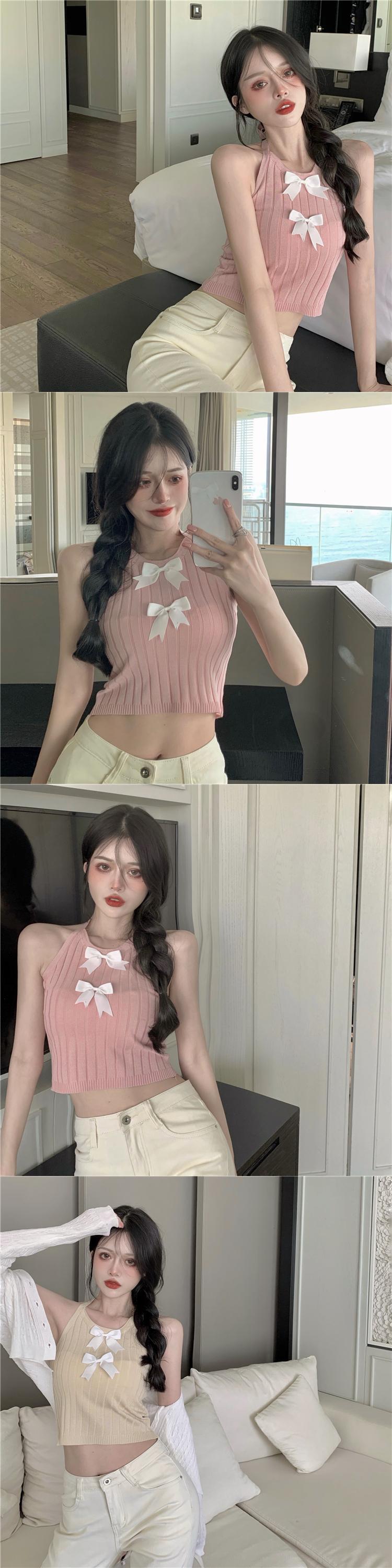 サマースタイルリボンレディースホルターショートニットセーター トップス 夏物 ハンチェンe95974111598